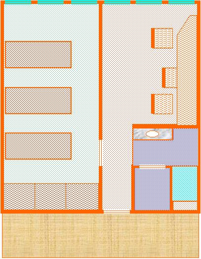 Nos apartamentos, havia um armário de madeira dividido em 3 compartimentos, cada um com 2 portas, 4 gavetas e sapateiro em baixo. Os cobertores eram padronizados mas havia cores como marrom, verde e vermelho.